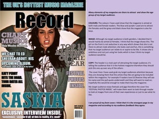 The document discusses how the magazine targets its audience through various design elements. It uses colors like blue and purple to attract female readers and greys and blacks for male readers. The front cover image of a girl is meant to appeal to but not seduce female readers. Headlines and artist names are used to grab attention and advertise content. Images of both male and female artists are included throughout to represent both genders. Feedback showed the contents page could be improved with better layout and copy.