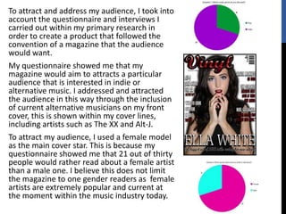 To attract their intended audience of indie/alternative music fans, the document's author created a magazine covering current alternative artists like The XX and Alt-J on the cover. They also featured a female cover model based on research showing readers preferred female artists. The author addressed the audience by releasing the magazine monthly to provide regular new content, and priced it at £2.90 which was within the popular price range identified in the research. The magazine's design, features, and article styles were tailored based on audience research findings to attract and engage the target readership.