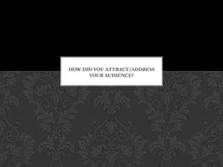 The document describes the design and content choices for a magazine targeting an indie/rock music audience. To attract this audience, the designer focused on simplicity while being eye-catching through the use of block colors, photos, and a consistent font. Both genders were considered by drawing inspiration from other popular music magazines. The front cover features the magazine name, taglines with band names, and a festival headline to entice readers. Inside, block colors highlight text and a variety of music and fashion topics aim to appeal to the target audience's interests.
