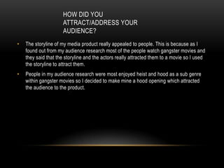 The author attracted their audience to their media product through an engaging gangster storyline that appealed to viewers of the genre. They focused on a heist/hood subgenre that research showed was popular. An opening scene was shared on YouTube and got positive feedback from viewers, though some said they wanted more dialogue and thought the gun close-up was poorly done.