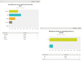 The filmmaker used Survey Monkey and social media to get feedback from their target audience on ideas for an opening scene depicting a woman being stalked. Respondents liked aspects that made the stalking feel realistic and generated mystery, but disliked that not enough time appeared to pass. They also wanted more stalker footage and a shot of the woman panicking after seeing her stalker. This feedback informed changes to improve tension and match audience expectations for the thriller genre.
