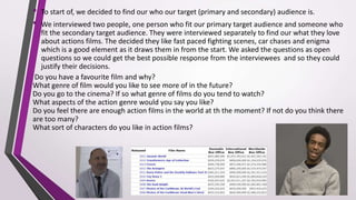 The document discusses the film opening "Retundum" and how it addresses the audience. It uses an attractive main character and focuses on the antagonist's plot to destroy a wealthy city. Though it features a male lead instead of the preferred strong female, most action films have male characters. The film opening builds mystery through its title, abandoned setting with few distractions, and unanswered questions about the murdered hostages. It aims to entertain the audience and leave them wanting more through enigma and suspense.