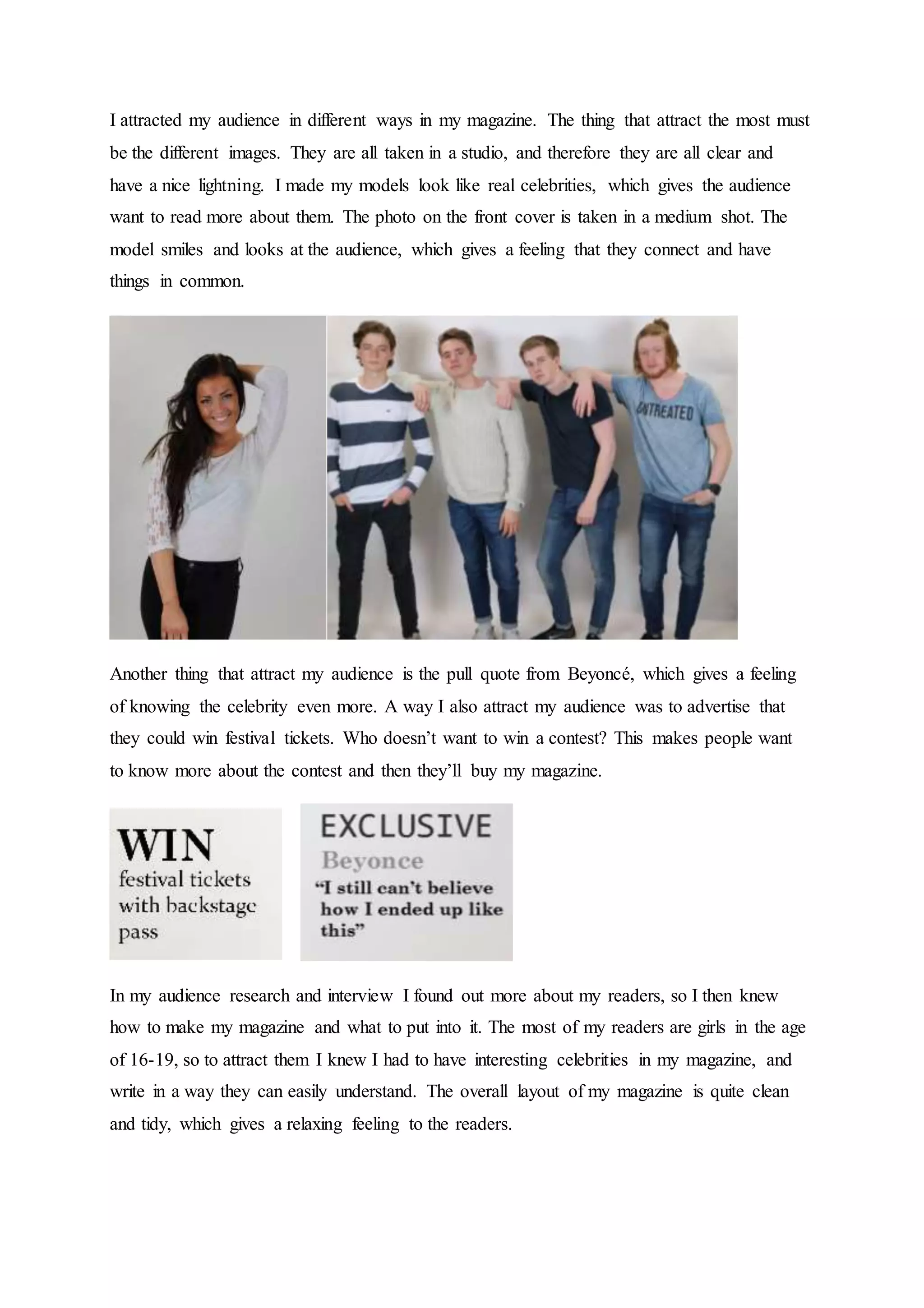 The magazine attracts its audience through clear, well-lit celebrity photos taken in a studio. The models are made to look like real celebrities to pique readers' interest. A pull quote from Beyoncé and advertising a contest prize of festival tickets also attract readers. Research found the target audience is mainly girls aged 16-19, so the magazine focuses on interesting celebrities and a clean, relaxing design for easy reading. Inspiration was drawn from the popular music magazine Q in terms of design and content. Clean colors like grey, white, and black are used to attract more readers.