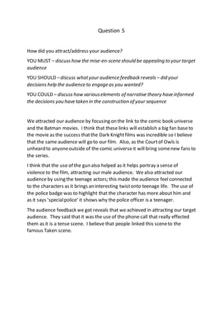 We attracted our audience by linking the film to the popular Batman comic book universe and movies like The Dark Knight, which would appeal to existing fans. Using the mysterious Court of Owls villain that is unknown outside the comics also brought in new fans. Our target male audience was attracted by the inclusion of gun violence. Additionally, using teenage actors for the lead roles made the audience able to relate to the teenage characters. Audience feedback confirmed that these elements, particularly a tense phone call scene similar to one in Taken, helped engage viewers as intended.
