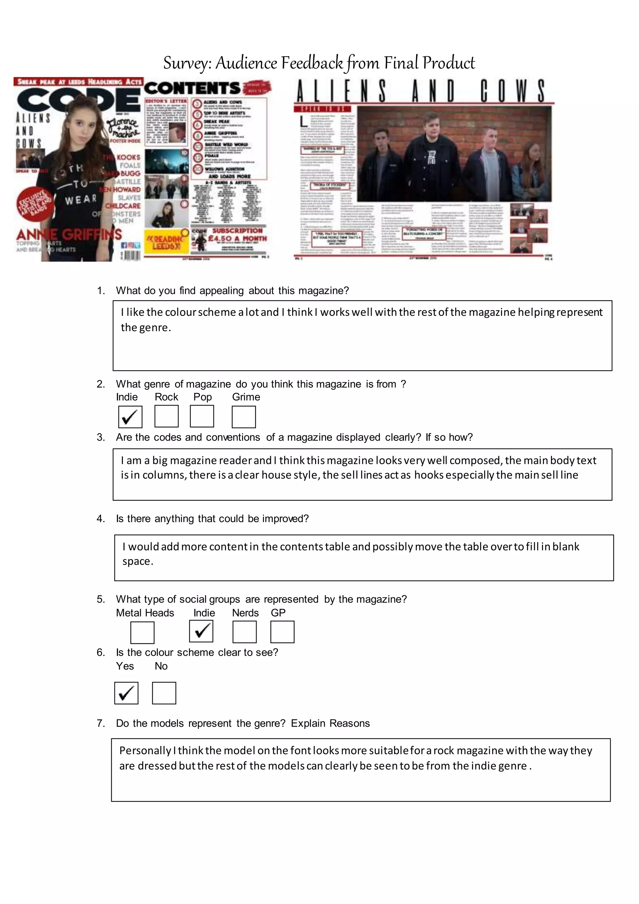 The survey responses indicate that the magazine was appealing due to its clear color scheme that helped represent the genre. The respondent identified the magazine as indie based on the social groups represented and felt the codes and conventions of magazines were on display through the column text layout and clear house style. Minor improvements such as adding more content to tables and filling blank space were suggested, and while the front model appeared more suitable for rock, the other models clearly represented the indie genre.