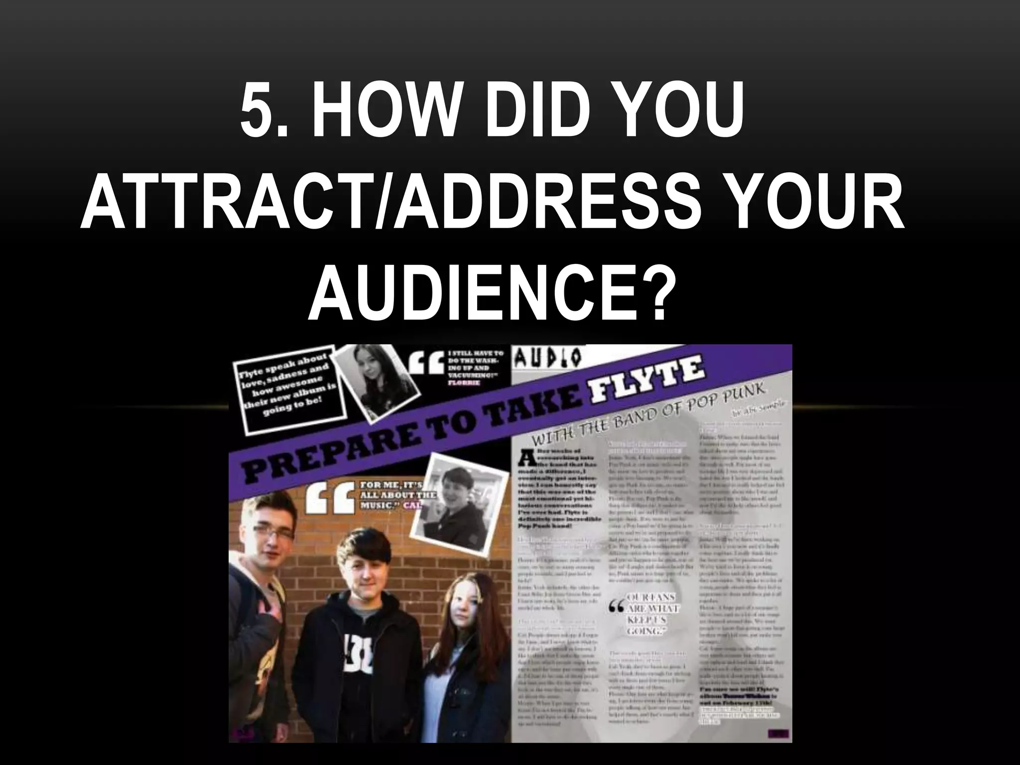 The document discusses various design elements and content included in a magazine to attract and engage its target audience of music fans aged 16-24. These elements include an unusual font and guitar image in the masthead to draw readers in, competitions to win concert tickets, pull quotes highlighting article content, varied fonts and colors on the cover, interviews with popular bands, behind-the-scenes images showing the human side of artists, and details about upcoming album releases. The goal was to create a magazine that appealed to the interests of the target readership through visual design, relevant content, and a personal connection with artists.