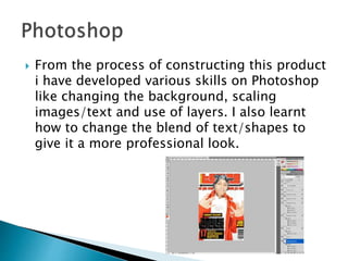 From constructing this product, the author learned Photoshop skills like changing backgrounds, scaling images and text, and using layers. They also learned how to blend text and shapes to make the product look more professional. Different fonts were used from Photoshop and other websites to add typography. Photography skills were developed during a photo shoot by experimenting with camera angles, compositions, and props to make the images look professional.