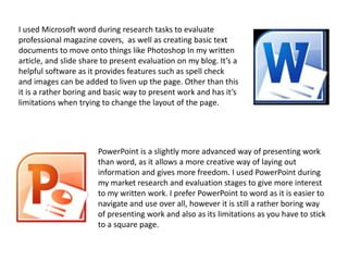The document discusses the various technologies the author used during their project to research, create, edit, present, and evaluate their work. These included Microsoft Word for basic documents, PowerPoint for presentations, Photoshop to edit photographs and design magazine pages, a Nikon camera to take photos, Prezi for innovative presentations, SoundCloud to present audio, SlideShare to upload presentations, a USB stick to transfer files, Blogger to present work online, and Facebook to create a focus group for feedback. The author learned new skills with each technology and found that technological convergence made the entire process much easier than if they had to use separate devices and print out work.