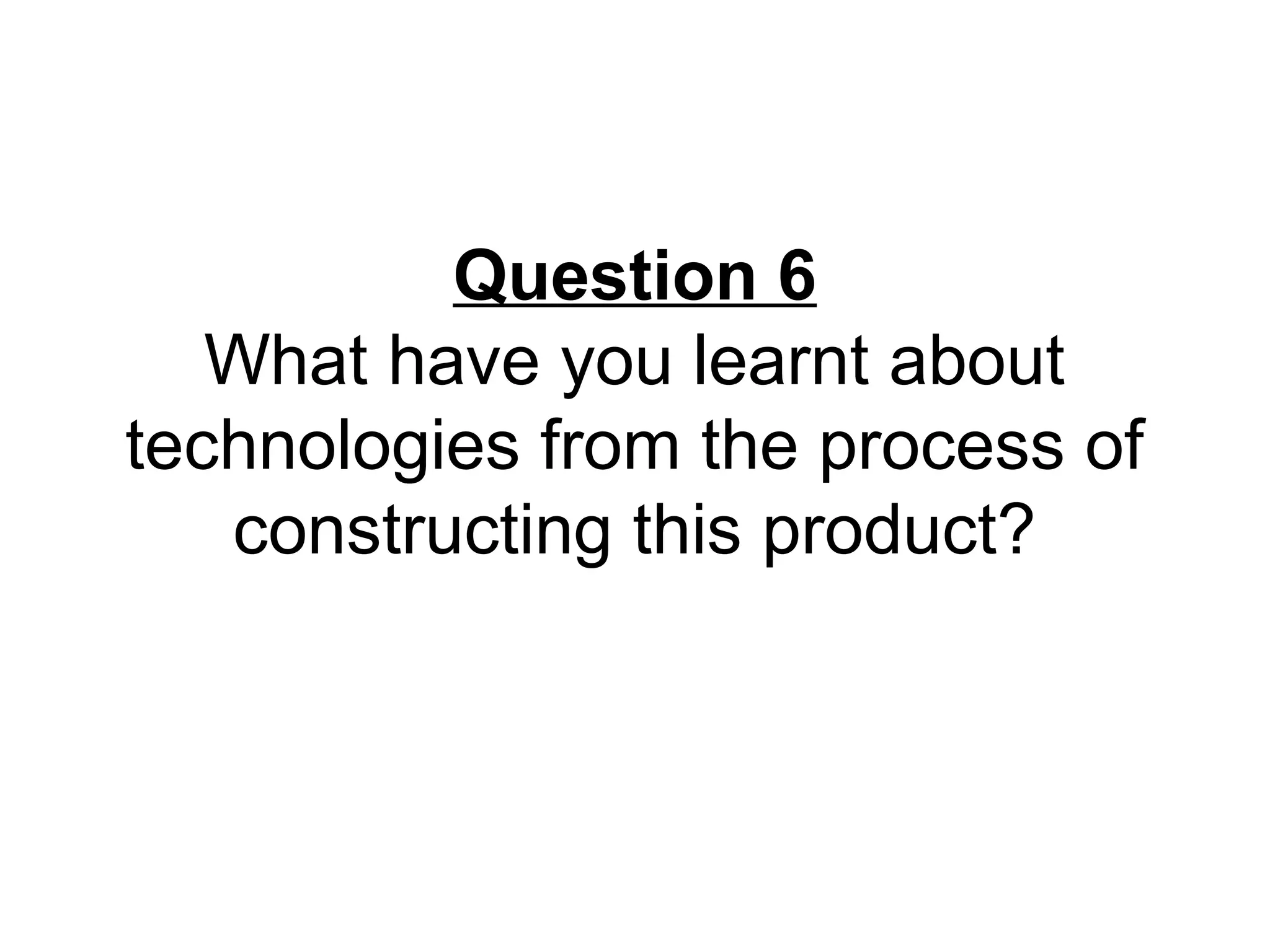 During the process of constructing this product, the author learned to use several new hardware and software technologies. They used a green screen for presentations, Apple Mac computers, and Photoshop for the first time. Photoshop allowed them to quickly and easily edit photographs using tools like the Quick Selection Tool. Online software like Prezi, iMovie, Voki, YouTube, and SlideShare were also utilized. These programs helped with presenting work, adding creativity and comedy to evaluations, sharing videos, and displaying documents without downloads. Overall, the author gained experience with multiple technologies through planning, research, and construction of this project.