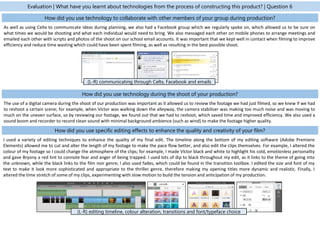The student used various technologies throughout their coursework process. They used PowToon, Prezi and PowerPoint to plan their blog and decided to continue using Prezi and PowerPoint as they looked more professional. When researching camera techniques, they took photos and edited them in Photoshop, and made a video in Windows Movie Maker to show camera movements. During their thriller case studies, they included screenshots, YouTube clips, and information from websites in their Prezi and PowerPoint presentations.