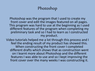 The document discusses several technologies the author learned about through constructing their music magazine product. They learned to use Photoshop and InDesign programs to create pages and edit images. They also learned how to use blogging websites like Blogger, feedback tools like Padlet, survey tools like SurveyMonkey, SLR cameras for high quality photos, and presentation software like Prezi. Through using these technologies repeatedly in drafting their product, the author improved their skills in using features of each program or tool.