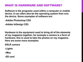 The document discusses hardware and software technologies used to create a music magazine. It describes using Adobe Photoshop to create layers and cut out images, Microsoft Word to write articles, and Adobe InDesign to layout pages. A Nikon DSLR camera, horseshoe flash trigger, strobe flash, and backdrop were used for photography. Through this process, the author learned to use various software programs, how to effectively use photography equipment, and improved their skills in constructing a magazine.