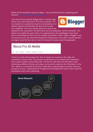 The document discusses the various technologies used during the different stages of filmmaking - pre-production, production, and post-production. During pre-production, technologies like Prezi and Inspiration 8 are used to create presentations and storyboards. In production, different cameras ranging from simple digital cameras to advanced 3D cameras are used, depending on budget. Post-production involves editing software like Premiere Pro to edit footage and add special effects. The distribution process also utilizes various technologies as trailers are shared online through sites like YouTube to promote films. Overall, the document demonstrates how technology plays a crucial role throughout the entire filmmaking process for all film companies.