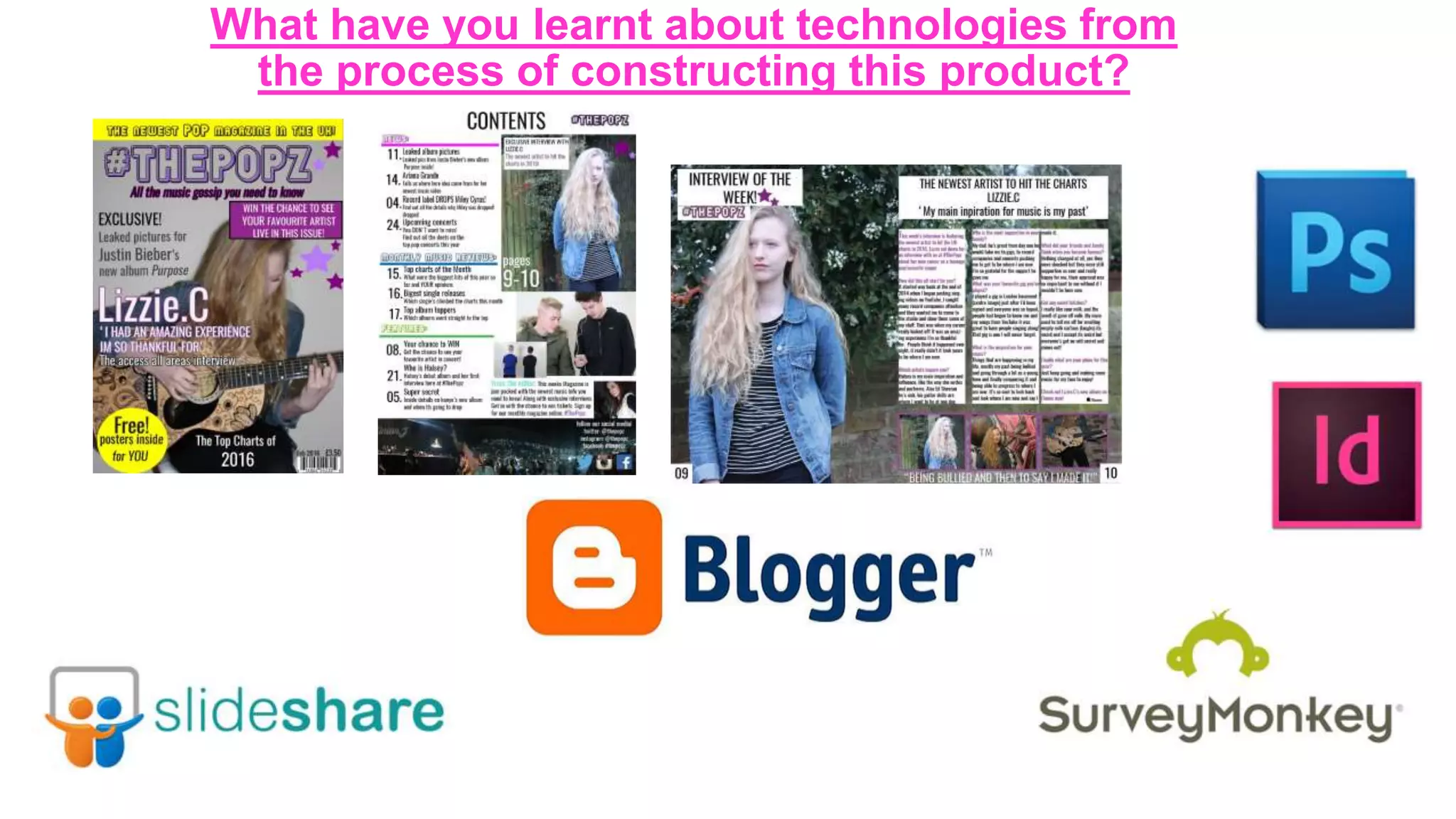 I learned many new skills using Adobe Photoshop and InDesign to create magazine pages, including how to use different fonts, add effects, make backgrounds transparent, and layer images. While Photoshop allowed more advanced image editing, InDesign made it easier to layout images and text but was less capable for photo editing. I also used SurveyMonkey to conduct market research, which helped ensure I created a magazine that fit my audience's interests. Additionally, I utilized SlideShare to simply present my survey results, market research, and evaluations. Finally, Blogger proved a convenient platform to upload and publicly share all my project work in an organized, viewable manner from any device.