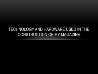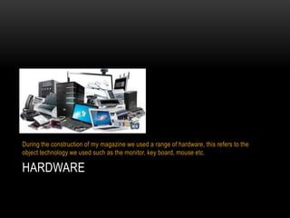 The document summarizes the hardware and software used to create a magazine. It describes the camera equipment including a Nikon DSLR, flash triggers, and strobes. Photoshop and InDesign were used to edit photos and layout the magazine respectively. WordPress was used as a blogging platform to share coursework. PowerPoint was used to create a presentation evaluating the magazine project.