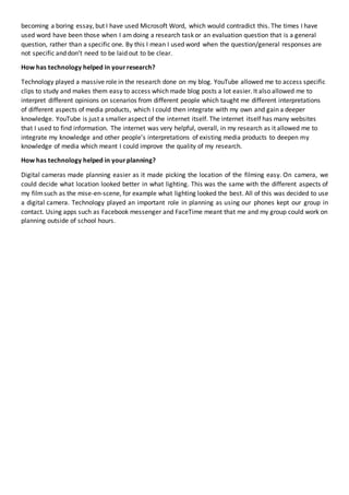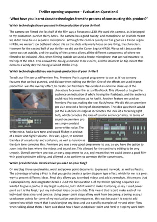 The document discusses the technologies used in the production and post-production of a thriller film. A Panasonic LZ30 camera was used to film the first half while a Canon Legria HFR26 was used for the second half outdoors scenes. Premiere Pro was used for editing and effects like overlays for flashbacks. Sound effects like white noise were added to create tension. Technology helped with research through accessing clips on YouTube and information online, and with planning through using digital cameras to choose locations and test lighting and keeping the group communicated through phone apps.