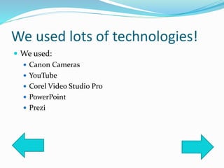 This document discusses the various technologies used to create a product and what was learned from using each one. The technologies included Canon cameras, YouTube, Corel Video Studio Pro, PowerPoint, and Prezi. For each technology, the document lists skills that were learned, such as how to record and adjust camera settings, upload videos to YouTube, edit video brightness and transitions, create hyperlinks and slide transitions in PowerPoint, and link fields in Prezi.