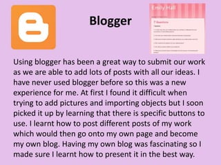 The document discusses the various technologies and skills the author learned throughout creating a film opening for a class project. They learned how to use blogger to create posts and share their work online. They also learned how to operate camera equipment like tripods and adjust settings. Finally, they discussed learning how to use Final Cut Pro to edit clips, add titles, import music, and use other features to finalize their film. Overall, the author gained experience with different media technologies and filmmaking skills through this project.