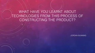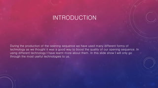 Jordan Bunning discusses the various technologies used to create an opening sequence for a film project. Blogger was used to document progress, and taught the importance of keeping track of the production process. YouTube provided research on other opening sequences to gather techniques, and also supplied royalty-free music, sound effects and stock footage. The editing software Serif MoviePlus X5 was used to trim clips, add transitions, and implement sound and titles. Sound design was crucial for immersion, and a voiceover with music was chosen over royalty-free sound effects. A Canon EOS 600D camera captured high quality HD video and audio that benefited the opening sequence.