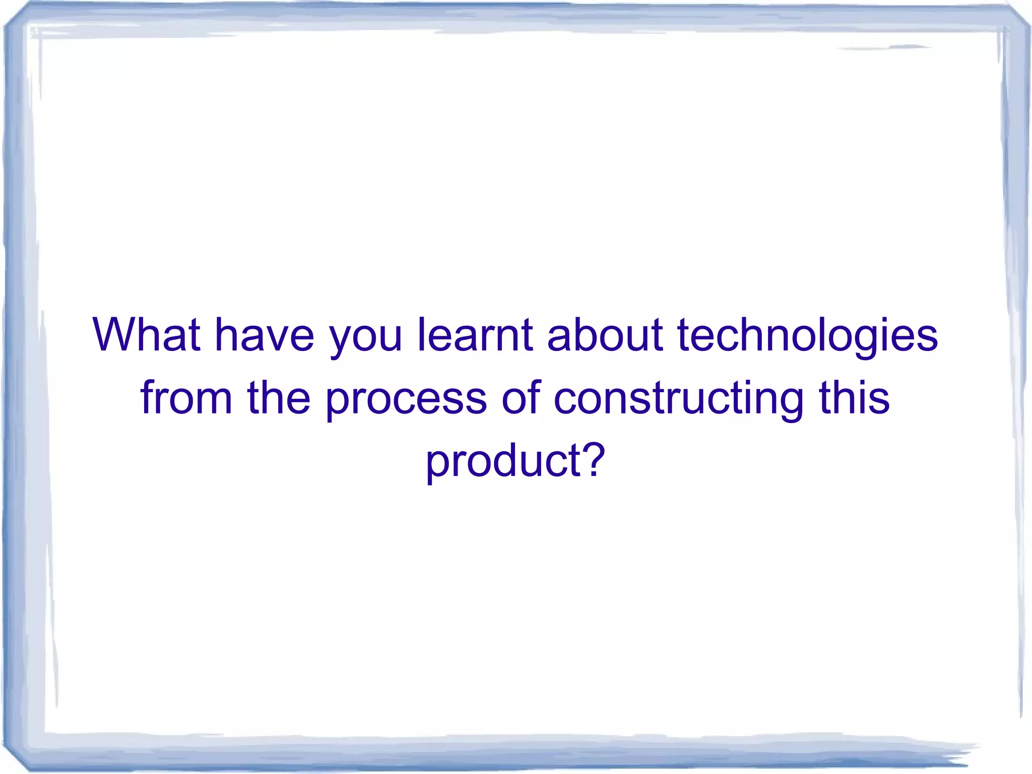 From producing this project, the student learned about various video and audio equipment, including a Canon camcorder, tripod, dolly, Bose microphones and boom pole. They also gained experience using editing software Final Cut Pro, though found it more complex than their usual software Sony Vegas. Overall, the project exposed the student to new technologies and they now have a better understanding of the equipment needed to produce video content.