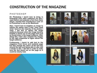 The document discusses various technologies and software that the author learned while constructing their magazine project. They learned how to use Photoshop to import fonts, brighten and crop images, and add text boxes. In InDesign, they learned to layout magazine pages in the correct order and import Photoshop files. Other software covered includes Prezi, GoConqr, and Powtoon for presentations, PowerPoint for additional presentations, Word for formatting text, iMovie for video editing, and Blogger, Slideshare, SoundCloud, and YouTube for uploading and sharing content online.
