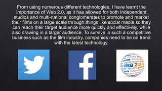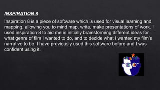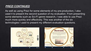 Word was the main format used by the author to present ideas, plans, research, and work for an evaluation project. Word allowed the author to easily include images and neatly present work. As someone familiar with Word, the author was confident in using it to effectively present work. The author also used Google Chrome to research science fiction, thriller, and fantasy films during pre-production and production, allowing them to find information on target audiences and genre conventions. The familiarity with Google Chrome made research easier. Equipment used for production and post-production included a Canon DSLR camera, tripod, microphone, memory card, computer, and Adobe software like Premiere Pro and After Effects.