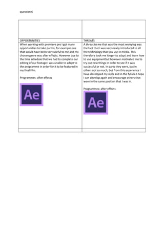 The document discusses the strengths, weaknesses, opportunities, and threats of a film project. For strengths, it mentions good use of locations, shots, and sound. Weaknesses included difficulties finding suitable backing music and fully utilizing Premiere Pro skills. Opportunities included learning After Effects, but lack of time prevented using it. The main threat was being newly introduced to the media technology, which took longer to learn but provided motivation to develop new skills.