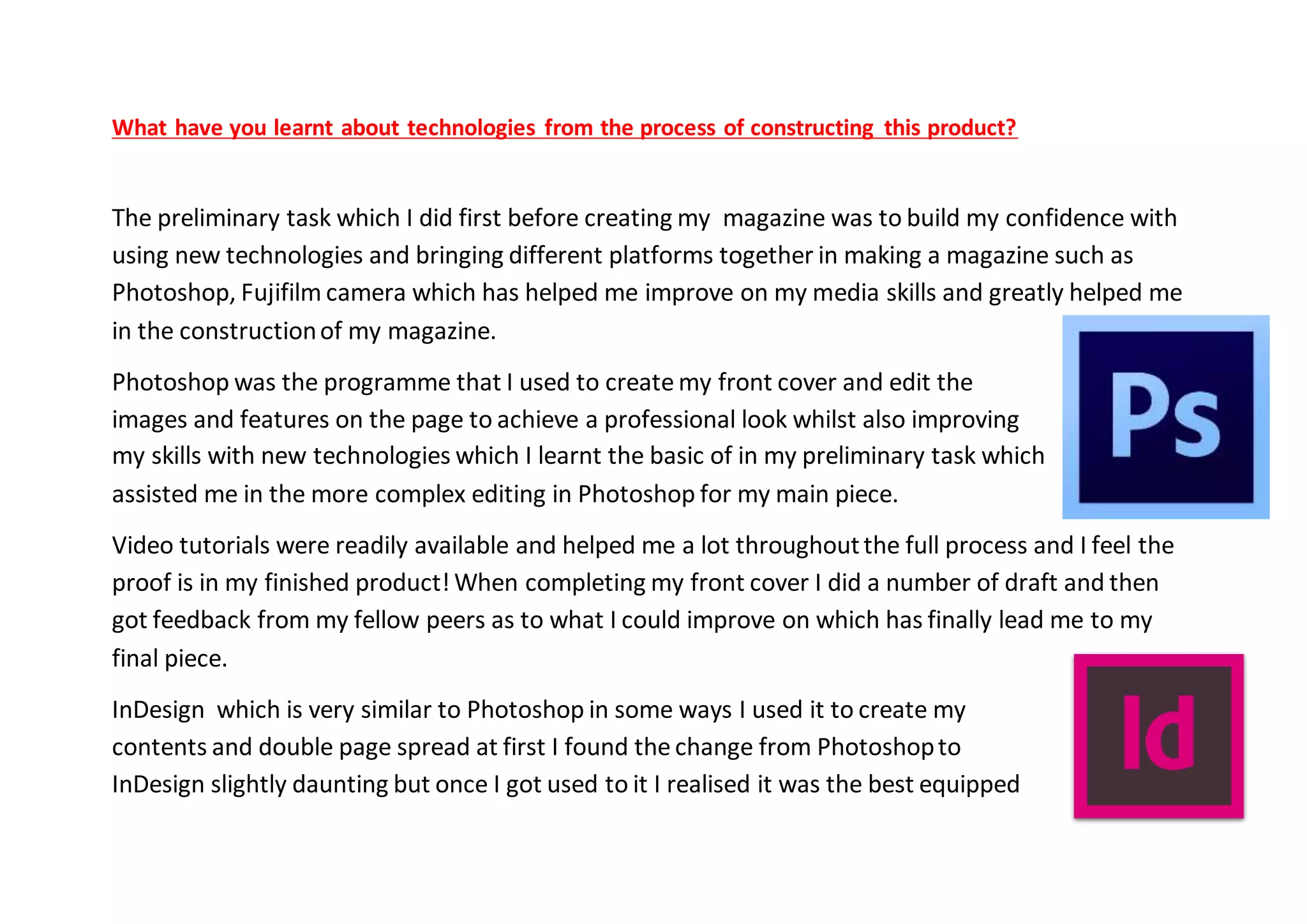 The document discusses various technologies the author learned to use in constructing their magazine product. They gained skills in Photoshop for image editing, InDesign for layouts, Prezi for presentations, blogging platforms, survey tools, and DSLR cameras. At first some programs like Photoshop, InDesign, and SurveyMonkey were challenging to learn but through practice and feedback the author improved. They now feel confident applying these new technological skills to future projects.
