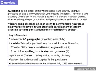This document provides guidance on answering Question 6 from the AQA English Language Unit One exam. It discusses that Question 6 is the longer writing task, worth 24 marks, and requires arguing or persuading a viewpoint over 4-5 paragraphs. It emphasizes organizing ideas clearly with accurate spelling, punctuation and grammar. Sample exam questions and an exemplar paragraph are included to demonstrate developing a point with examples and language devices. The document concludes with a skills checklist and mini-assessment practice question.