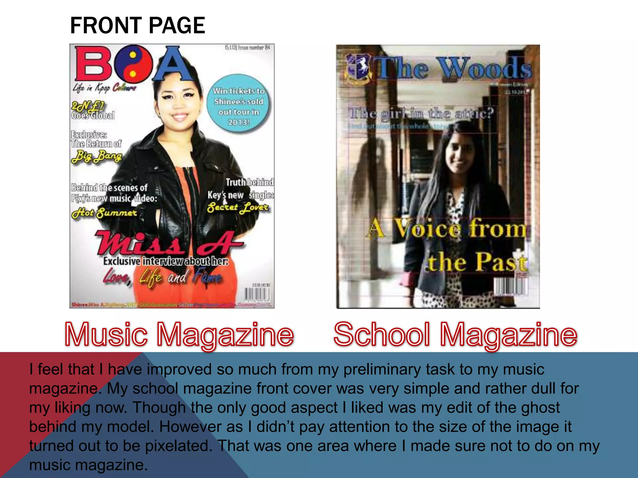 The student created a music magazine for their AS task that was a significant improvement over their preliminary school magazine. They developed stronger design skills and created more attractive and realistic pages, including a contents page and front cover. The student carefully managed their time, practiced using InDesign to build confidence, and edited images to avoid pixelation. They conducted target audience research, incorporated both masculine and feminine elements, and planned creative photo shoots to represent K-pop music.