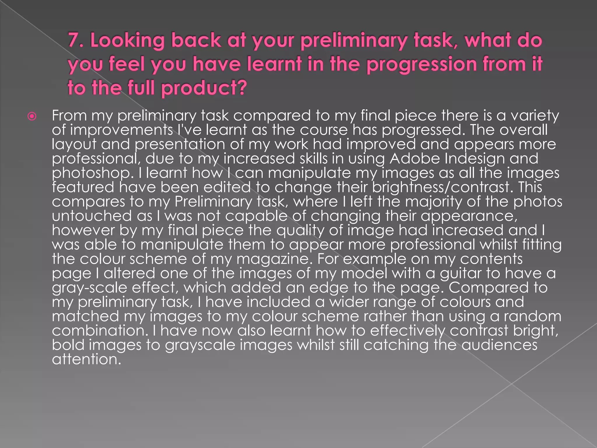 The document summarizes improvements made from a preliminary magazine project to a final project. Key improvements include enhanced skills in Adobe InDesign and Photoshop to better manipulate images and layout. For the final project, the author selected images more carefully, established a consistent color scheme, and learned to effectively contrast bright and grayscale images. Layout and design elements like fonts, borders, and page composition were also improved to look more polished and professional. Overall, the author gained valuable experience and skills in magazine design and publishing software.