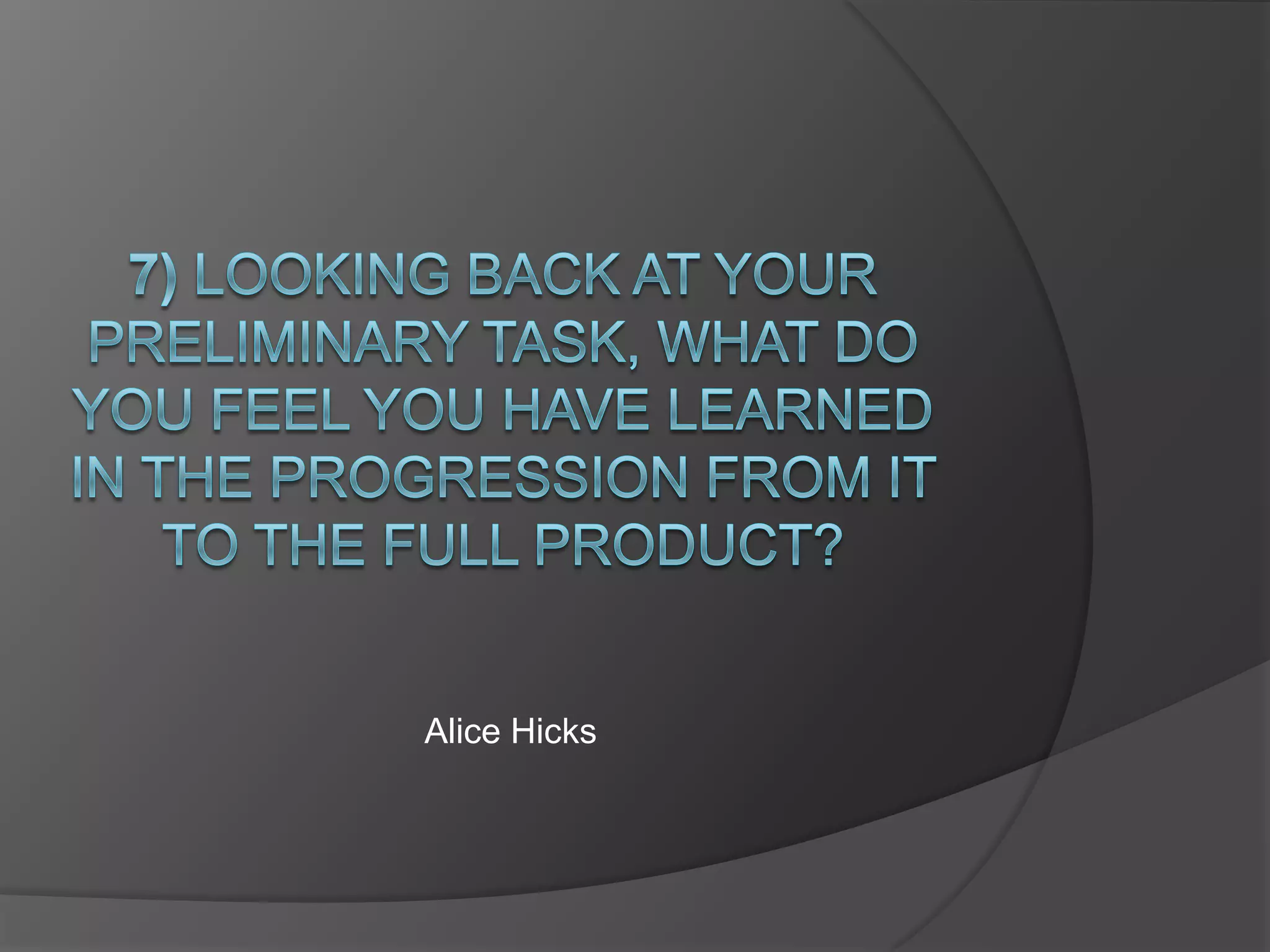 The document discusses the progression made from the author's preliminary task to their final product. They learned that sound is key for setting atmosphere and provoking emotion in audiences. While their preliminary task lacked sound effects and music, their final product "After Hours" used diegetic sounds and a dramatic score to create tension. The author also notes improvements in camera equipment led to higher quality footage. Larger cameras allowed for better zoom, steadiness and memory capacity compared to the flip cam used originally. Finally, the author felt editing skills improved the most, allowing them to add effects, transitions and enhance color/quality in their final piece.
