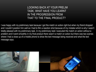 The author reflects on improvements from their preliminary task to the final product of a film assignment. In the preliminary task, they executed a match on action correctly but had difficulty positioning an actor. In the final product, they included close-ups of phone screens to show text messages. The author also discusses improving camera stability by using a tripod, achieving better angles, and ensuring titles and credits are properly timed.