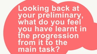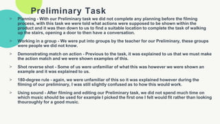 The document compares the filmmaker's process for a preliminary short film task versus their main film opening task. For the preliminary, there was little planning, research, or attention to conventions. However, for the main opening they spent significant time: 1) researching horror film conventions, 2) planning locations, costumes, sounds, and story, 3) finding suitable actors through casting, 4) choosing an appropriate soundtrack, 5) using professional editing software, and 6) implementing lighting, titles, and sounds that fit genre conventions. This extensive planning and research resulted in a higher quality final product.