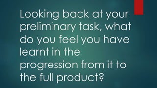 In our preliminary film, we only used a few basic shot types and did not consider lighting, costumes, or setting. However, in our final film we employed a variety of shots including close-ups and point-of-view shots. We also put more effort into things like lighting, costumes, props, and settings. Additionally, our editing, sound, and continuity had improved as we shortened drawn-out shots, added music and effects, and ensured dialogue was audible over ambient noise.