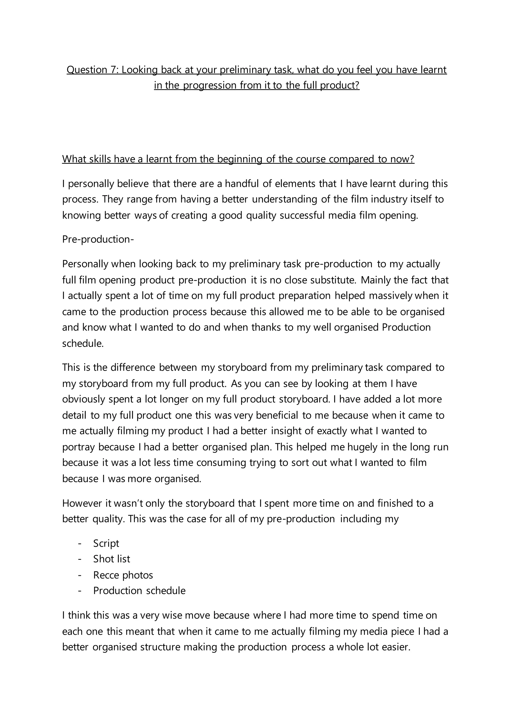 The document discusses the skills and techniques the author has learned throughout a film course. From their preliminary task to the final product, the author's skills in pre-production, production, and editing improved significantly. In pre-production, the author spent more time developing storyboards, scripts, schedules, and other materials for the final product compared to the preliminary task. During production, the author used better equipment like a higher quality camera, tripod, and microphone. They also applied specific lighting and filming techniques suited to their genre. In editing, the author learned skills like color correction, titles, and using After Effects, resulting in a more polished final product. Overall, the author felt they gained valuable experience and improved their filmmaking abilities