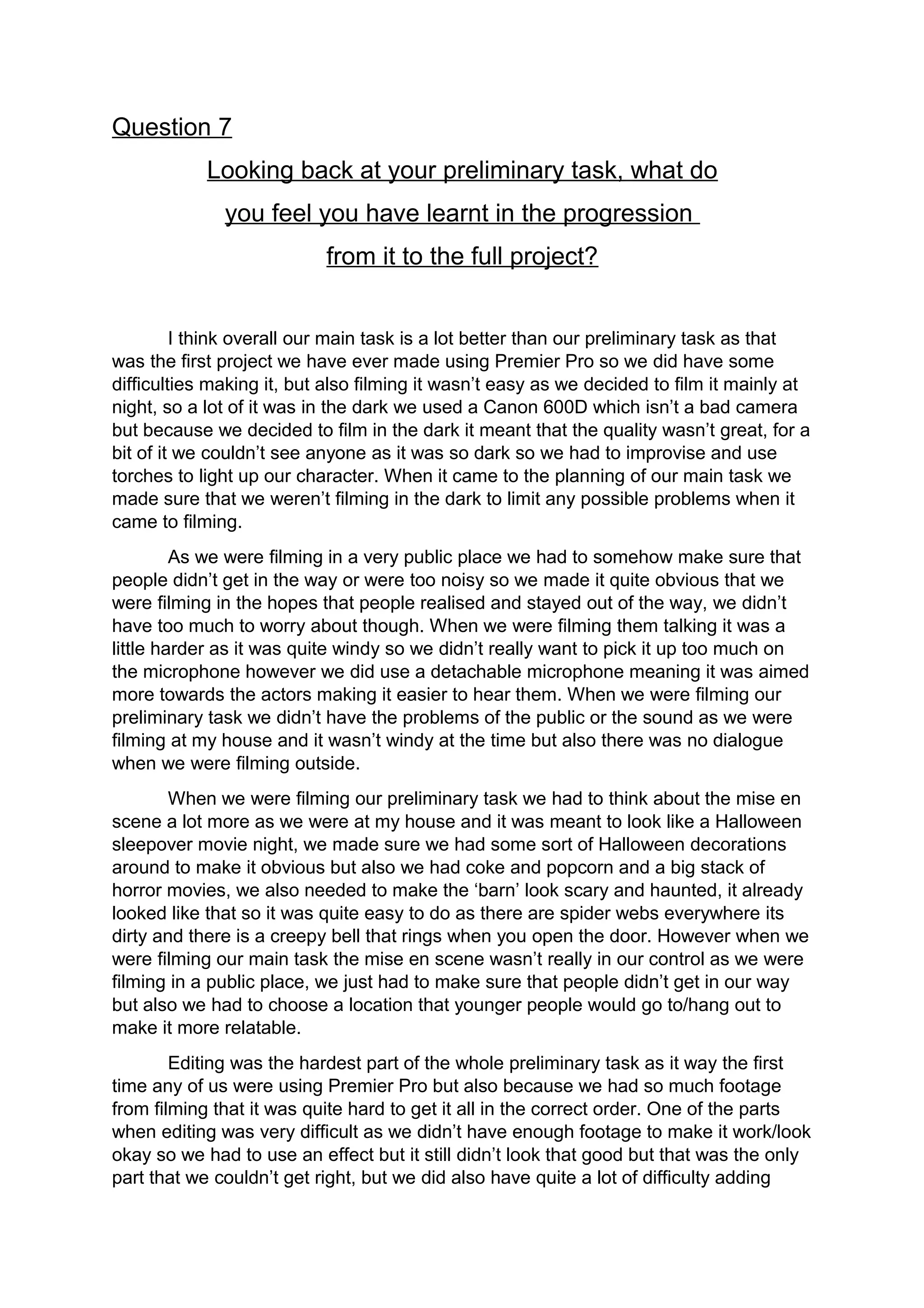 - The author reflects on improvements from their preliminary task to the full project. For the preliminary task, they filmed at night with a basic camera, resulting in low quality footage. For the main project, they planned better by filming during the day.