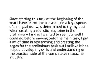 The student learned about magazine conventions and software skills by creating a preliminary school magazine. They put significant effort into research and design for the preliminary task. For the main music magazine task, the student felt their skills and knowledge had improved, allowing them to create a more professional product that incorporated audience feedback. The preliminary work helped the student improve and feel prepared for the larger project.