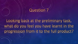 The document compares the author's preliminary and final magazine covers. For the final cover, the author used professional photography equipment which improved photo quality. They also used a medium shot of the cover model to allow for better posing. Additionally, the final cover included more organized cover lines placed in order to look more professional, and a contents page with more information and images to showcase the magazine's focus on new artists.