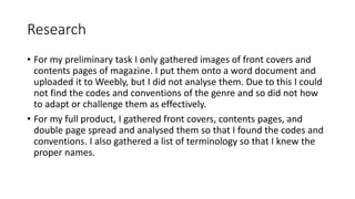 For their preliminary task, the student gathered magazine cover images but did not analyze them to understand codes and conventions. For the full product, they analyzed covers, contents pages, and spreads to identify codes and conventions. They also learned proper terminology. For planning, their preliminary task included a basic contents page sketch while the full product included labeled, detailed drafts and revisions. For construction, their preliminary task involved a rough image cutout while the full product utilized Photoshop tools for a cleaner cutout and included more researched details, original fonts and photos, showing improved skills.