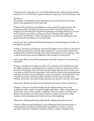 The producer discusses how the preliminary film title sequence task helped prepare them for the main film production. It helped them learn basic filming and editing skills like camera angles, shots, and creating titles. While the preliminary location and costumes were limited, it helped them realize areas to improve for the final project, such as choosing a location that better fit the dark theme. The preliminary also helped them learn editing software and basic effects, but they gained more experience with lighting, color correction, and advanced effects for the final product.