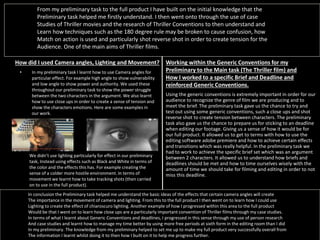 The document discusses what the author learned from their preliminary task that helped them with their full thriller production. They learned about maintaining the 180-degree rule and using match-on-action to create continuity between shots. They also learned how to use shot reverse shot to build tension. For their full production, the author expanded their knowledge of conventions like breaking the 180-degree rule for confusion. They also learned how to use lighting, close-ups, and research case studies to further understand thriller conventions and apply them more effectively. Managing timelines and negotiating roles within the group were also skills that improved from the preliminary to full production.