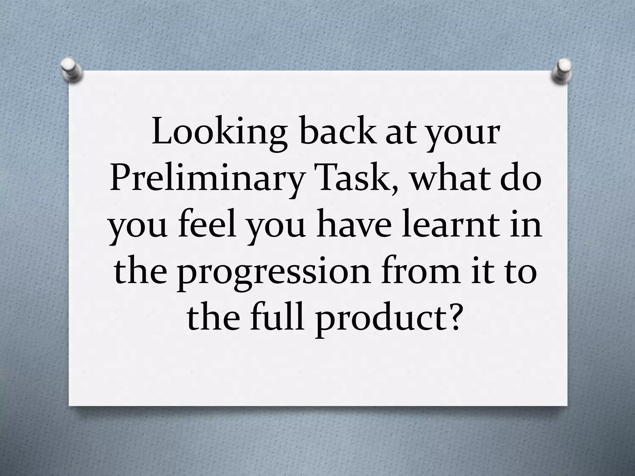 The document compares the front cover, contents page, and double page spread from the preliminary task to the final product.
