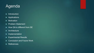 The document discusses the development of a web-based bilingual question answering system using machine learning techniques, focusing on its architecture, implementation, and experimental results. It highlights the advantages of natural language processing in facilitating user interactions and addresses the challenges in generating accurate responses to queries. The system demonstrates a high overall accuracy of 92% and plans for future enhancements including multilingual support.