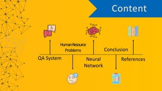 The document discusses question answering systems. It describes how QA systems can automatically respond to natural language questions by retrieving information from knowledge bases using information retrieval and natural language processing technologies. It also discusses problems in human resources like lack of full-time HR staff and low speed. Neural networks are described as a machine learning method inspired by the human brain that can predict outputs. Recurrent neural networks, LSTM, and sequence-to-sequence models with attention mechanisms are discussed as techniques for building QA systems.