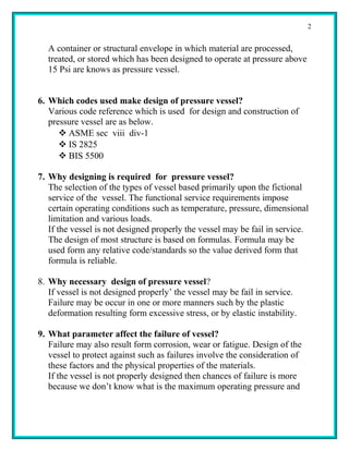 This document provides information on the design of pressure vessels. It defines pressure vessels as containers designed to operate above 15 Psi and discusses why proper design is important to prevent failure. The document outlines various codes used for pressure vessel design and stresses that vessels experience from internal pressure, weight, and other loads. It also describes common pressure vessel components like shells, heads, nozzles, and supports, and provides formulas for calculating thicknesses of different vessel components.