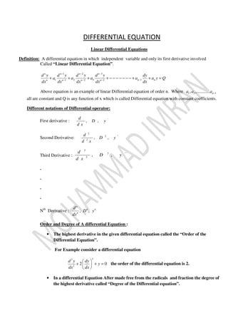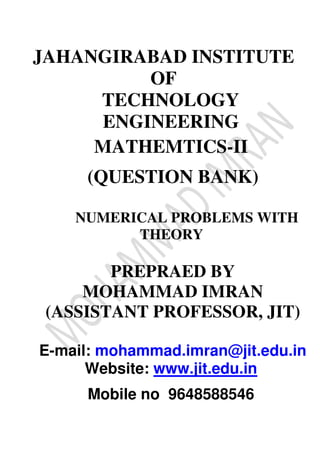 The document is a comprehensive question bank for Engineering Mathematics II at Jahangirabad Institute of Technology, detailing numerical problems and theories related to differential equations. It includes definitions, classifications (ordinary and partial), orders and degrees of differential equations, and various solution methodologies. Additionally, it contains numerous example problems with solutions, showcasing the application of the theories discussed.