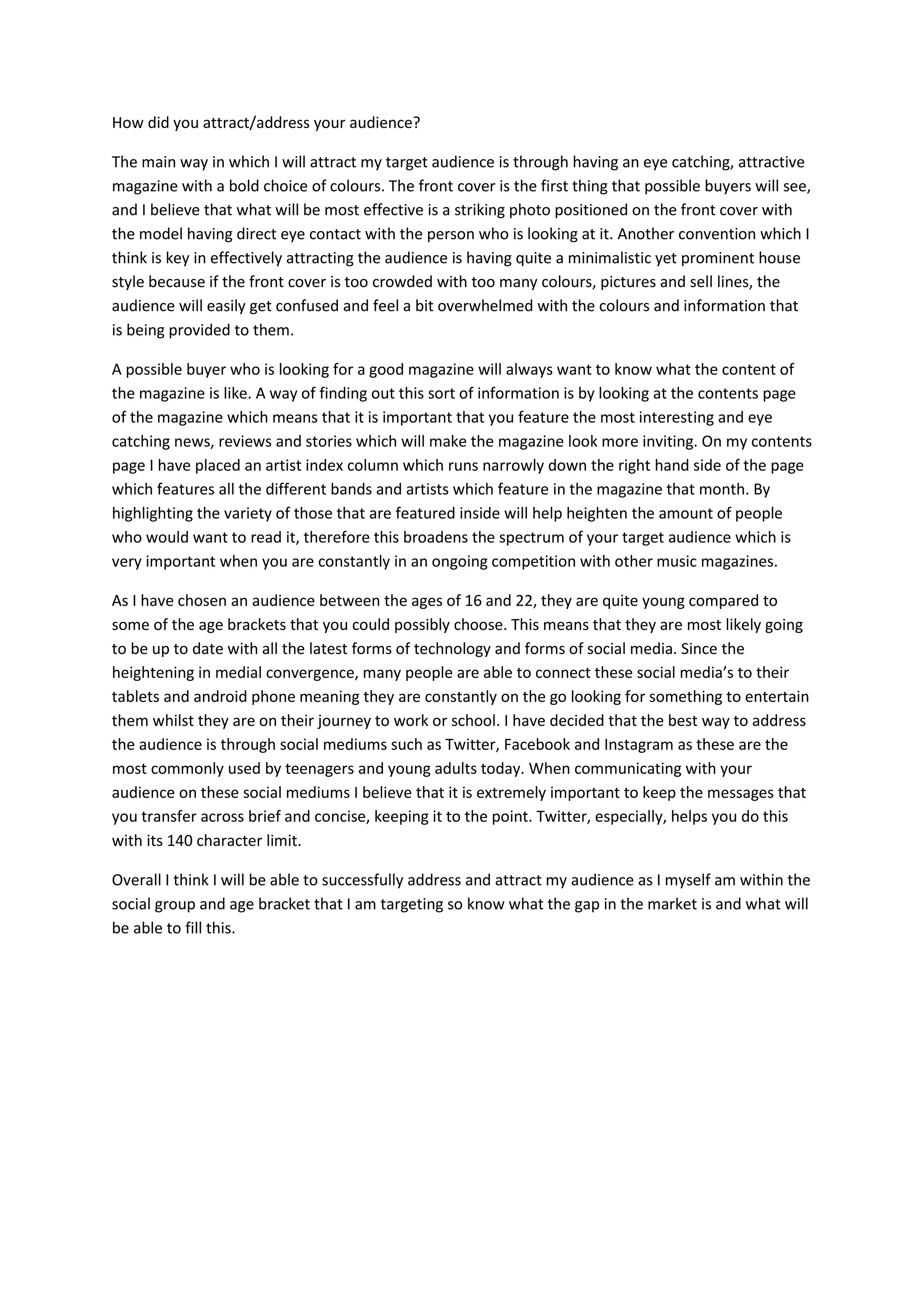 The document discusses strategies for attracting and addressing a target audience for a music magazine. To attract the audience, the magazine cover will use eye-catching colors and a striking front-page photo. The contents page will highlight a variety of artists featured in the issue. Since the target audience is ages 16-22, social media like Twitter, Facebook, and Instagram will be used to address them briefly and concisely as these platforms are most commonly used by teenagers and young adults. The strategies aim to attract buyers and broaden the audience for the magazine.