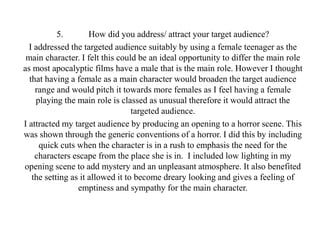 I addressed my target audience of female teenagers by making the main character a female teenager, differing from most apocalyptic films which feature a male lead. This was meant to broaden the audience to include more females. I also attracted my target audience by opening with a horror scene that utilized conventions of the genre, including quick cuts and low lighting to create mystery, an unpleasant atmosphere and emphasize the character's need to escape.