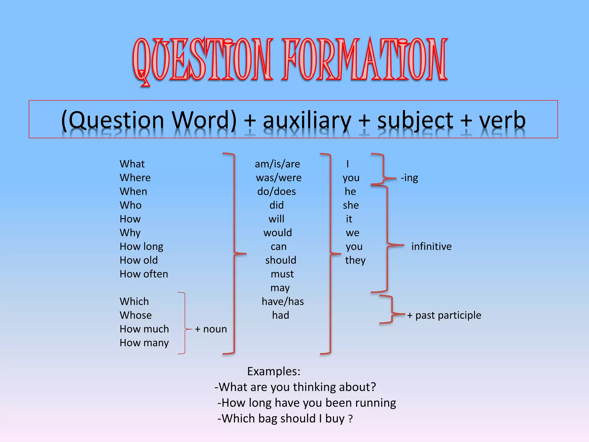 - Question words used to form wh- questions about subjects, objects, time, manner, etc.